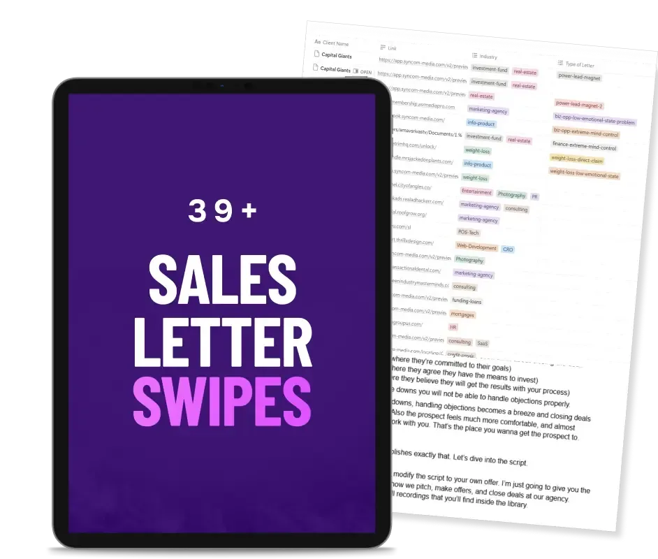 A swipe file of 39+ proven sales letters that generated $120M+ in sales across 47+ high-ticket niches — so you can model what already works instead of writing from scratch.